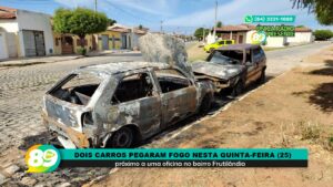 Dois carros pegaram fogo nesta quinta-feira (25) próximo a uma oficina no bairro Frutilândia